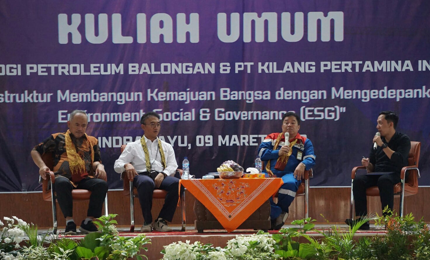 Kuliah umum yang digelar di GOR Institut Teknologi Petroleum Balongan (ITPB) menghadirkan 3 pemateri dari Pertamina, diantaranya SVP HSSE PT Pertamina (Persero) yang memaparkan materi tentang Project HSSE & ESG Implementation, kemudian Senior Project Manager Petrochemical Complex Jabar, I Gusti Bagus Prihanta, yang memaparkan materi terkait Industri Petrokimia, dan Manager Construction Revitalisasi RCC Balongan Muhammad Ramdhan yang menjelaskan tentang manajemen proyek.