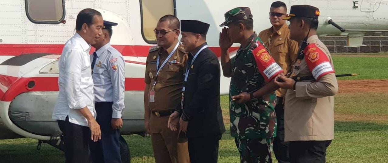 Presiden Jokowi dan rombongan tiba di stadion Sukung Kabupaten Lampung Utara pukul 14.49 WIB dengan menggunakan hellyped dan langsung menyapa warga di sekitar stadion.