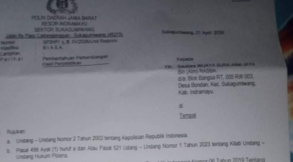 Surat tersebut diterbitkan pada 21 April 2026 dan ditujukan kepada Wijaya Surya alias Jaya, warga Desa Bondan Kecamatan Sukagumiwang Kabupaten Indramayu. Dalam surat dijelaskan bahwa laporan telah diterima dan ditindaklanjuti sesuai prosedur hukum yang berlaku.