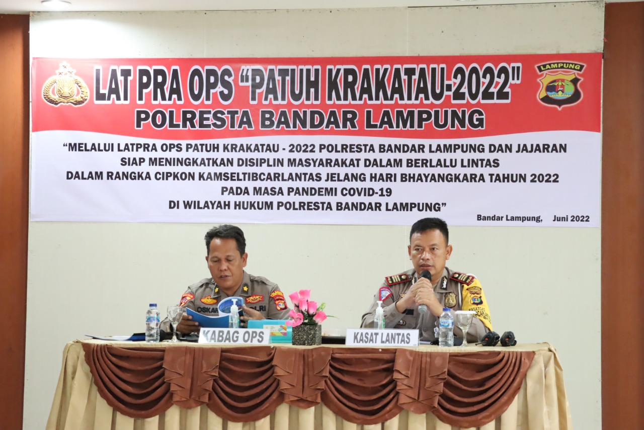 Kegiatan Latihan Pra Operasi (LATPRAOPS) Patuh Krakatau 2022 Polresta Bandar Lampung dipimpin Kabag Ops Kompol Oskar Eka Putra, SH., M.H. dengan didampingi Kasat Lantas AKP M. Rochmawan, SH.MM. dan diikuti Pejabat Utama Polres Bandar Lampung serta seluruh anggota yang terlibat operasi.