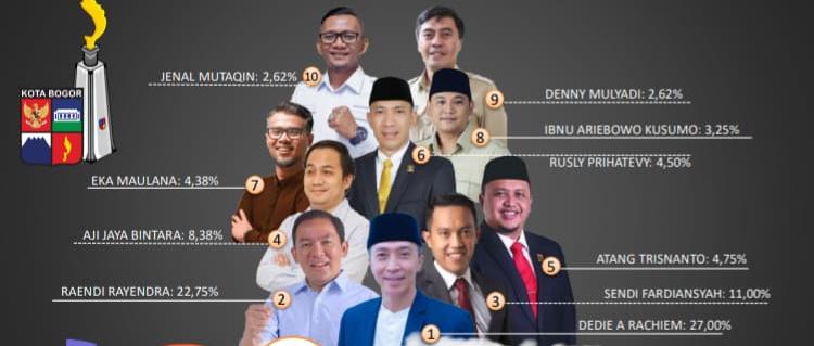 Dari sejumlah figur yang namanya masuk dalam calon peserta Pemilihan Kepala Daerah (Pilkada) 2024 di Kota Bogor, LS Vinus merangkum 11 nama hasil dari sampel 800 responden di 68 kelurahan se-Kota Bogor yang berlangsung pada 10-15 Juni 2024 lalu.