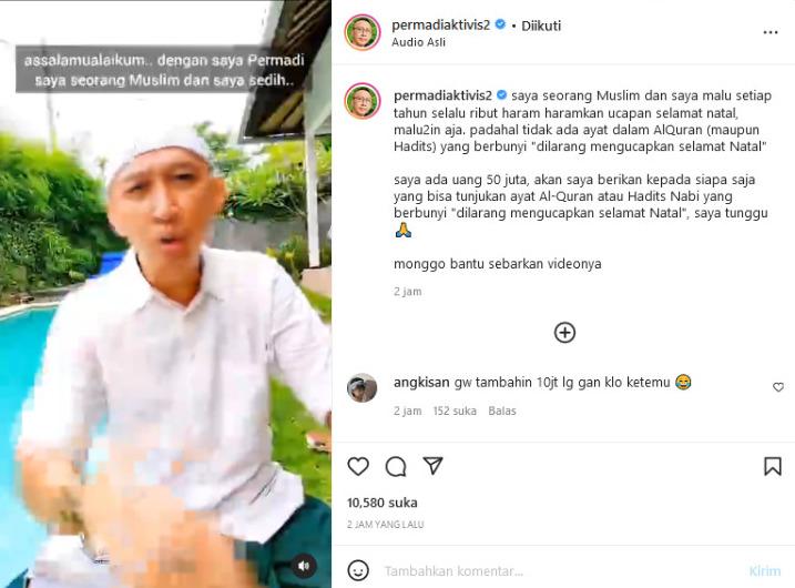 “Saya ada uang 50 juta, akan saya berikan kepada siapa saja yang bisa tunjukan ayat Al-Quran atau Hadits Nabi yang berbunyi “dilarang mengucapkan selamat Natal”, saya tunggu monggo bantu sebarkan videonya,” kata Abu Janda.