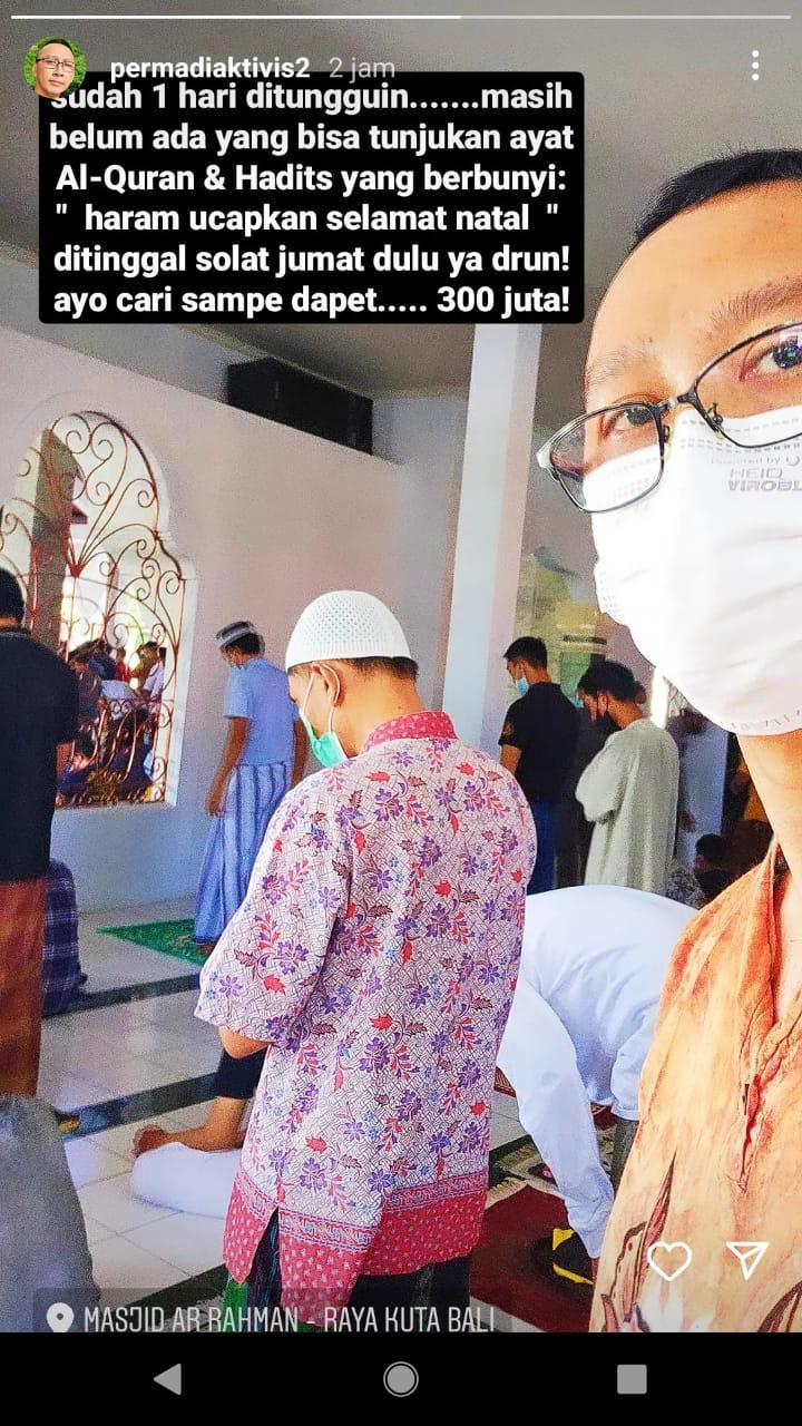 “Sudah 1 hari ditungguin..masih belum ada yang bisa tunjukan ayat Al-Qur’an & Hadits yang berbunyi: “haram ucapkan selamat natal” ditinggal solat jumat dulu ya drun!” kata Abu Janda.