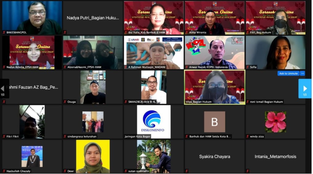 Bogor Jabar, SIBER88.CO.ID_Pemerintah Kota Bogor melalui Bagian Hukum dan HAM bersama dengan Penggiat Hak Asasi Manusia (HAM) di Kota Bogor menggelar sarasehan secara daring dengan tema “Efektifitas Memahami HAM di Kota Bogor dalam rangka Hari HAM Sedunia”.