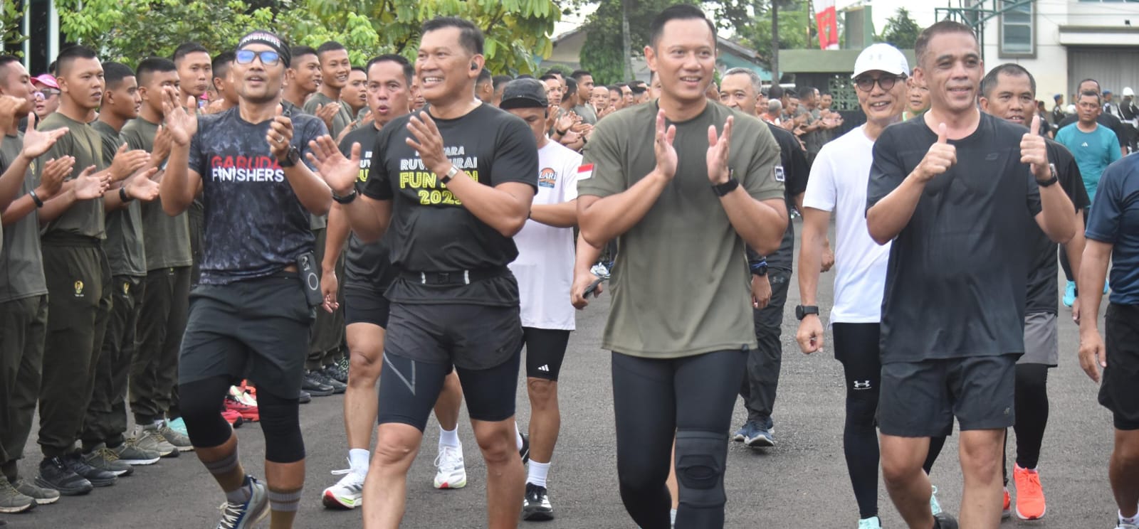 Lampung, SIBER88.CO.ID_Menteri Koordinator Infrastruktur dan Pembangunan Republik Indonesia, Agus Harimurti Yudhoyono, bersama prajurit Kodam XXI/Radin Inten beserta jajaran mengikuti kegiatan olahraga bersama di Kota Bandar Lampung, Selasa (14/10/2025).