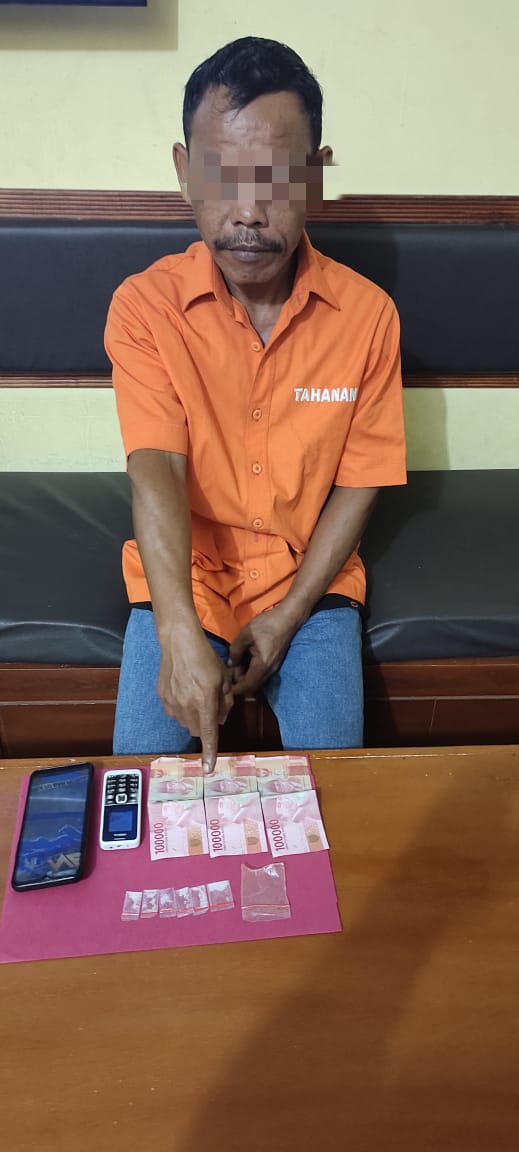 Dari tangannya berhasil diamankan 6 paket Pelastik bening berisi narkotika diduga jenis shabu, 2 HP merk Vivo dan Nokia, becak barang roda 3, uang Rp 300 rb.