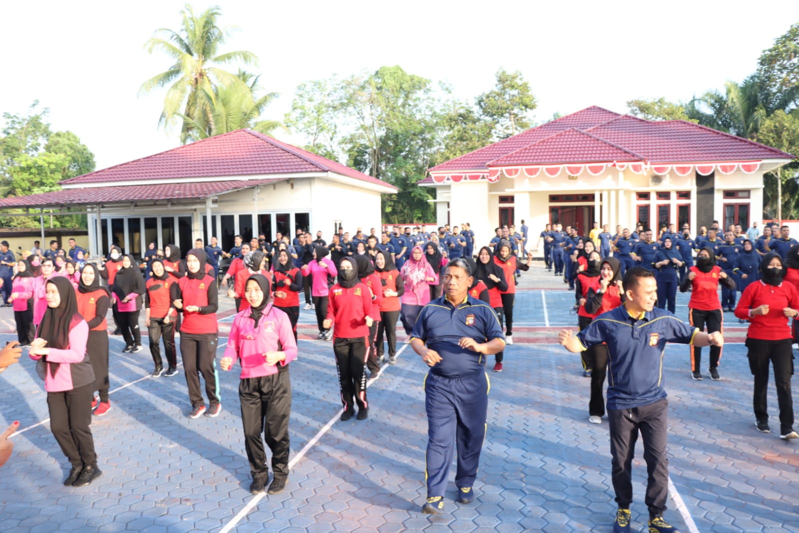 Kampar, SIBER88.CO.ID_Polres Kampar menggelar olahraga bersama Bhayangkari Cabang Kampar dalam rangka Hari Jadi ke-74 Polwan Tahun 2022 dan HKGB Ke 70 tahun 2022 di halaman Rumah Dinas Kapolres Kampar, Sabtu (27/8/2022) pagi