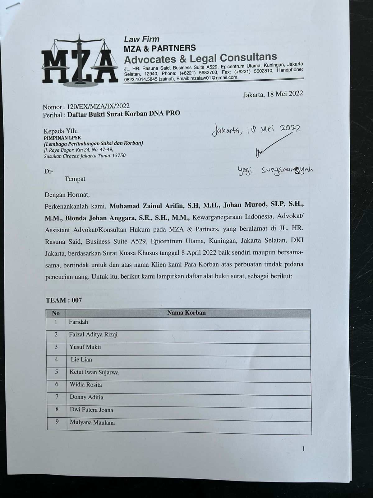 Jakarta, SIBER88.CO.ID_Tim MZA & Patners bersama para korban DNA Pro mengahadiri undangan konfirmasi dan klarifikasi dari LPSK terkait dengan laporannya kepada LPSK pada tanggal 19 April 2022 tentang Permohonan Perlindungan Fasilitasi Restitusi. Rabu, 18 Mei 2022.