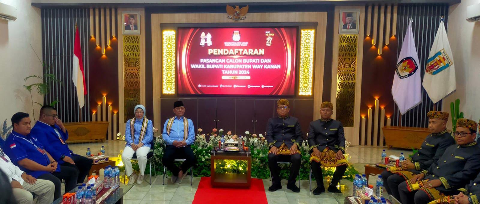 Pendaftaran pasangan dengan jargon Amanah itu tiba di halaman kantor KPU dan diterima oleh jajaran KPU Way Kanan yang ditandai dengan pemasangan selendang Tapis kepada pasangan Amanah oleh Sekretaris KPU Way Kanan.