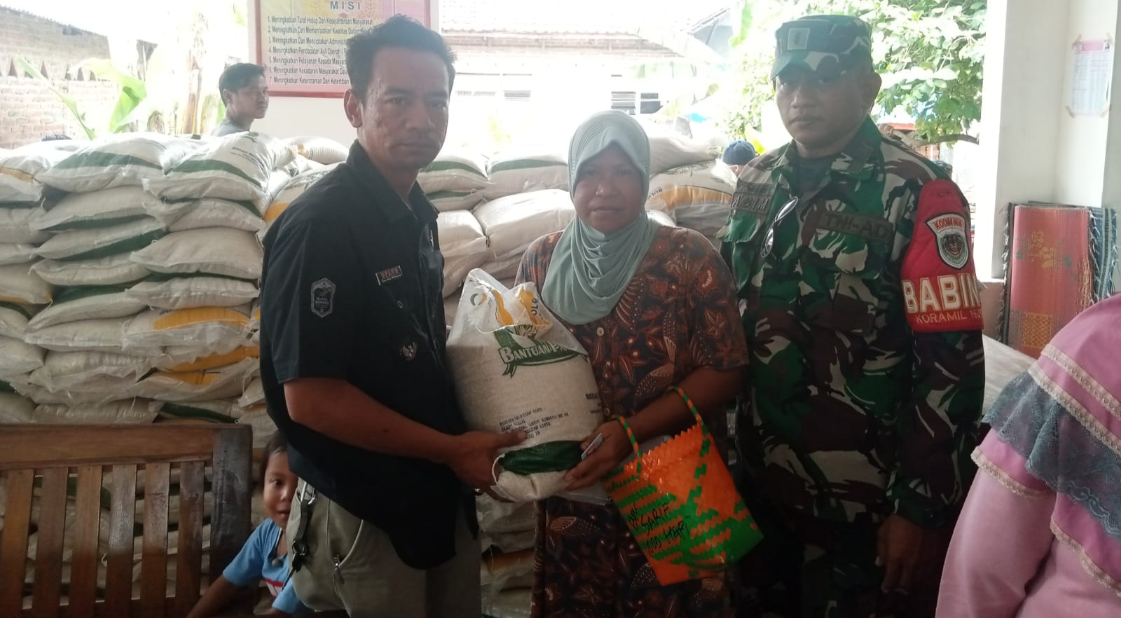 Bansos pangan berupa beras,masing-masing KPM menerima satu kantong berisi 10 kg beras.