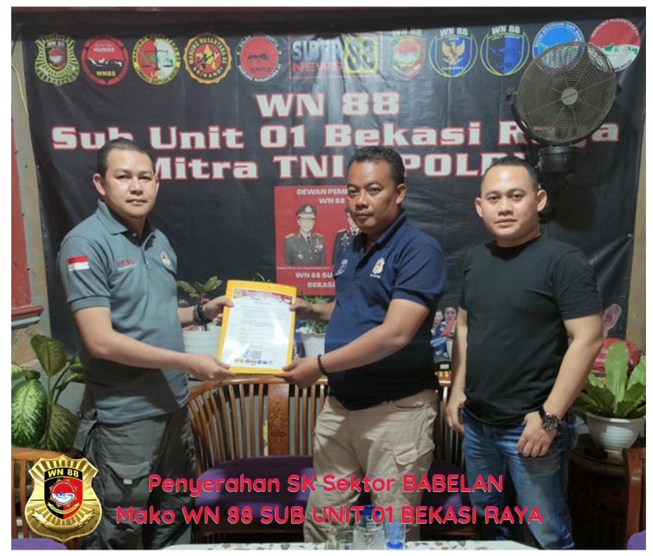 Pemberikan SK telah ditetap kan oleh Ketua Mahdi ” T.bob ” Soekarta. S.Thi. WN 88 Sub Unit 01 Bekasi Raya, untuk kepengurusan WN 88 Sektor Babelan sebagai berikut. Ketua Iwan, Sekretaris Dicky Pratama, Bendahara Irwan, Penyerahan SK kepengurusan di serahkan langsung oleh Ketua Mahdi ” T.bob ” Soekarta. S.Thi.
