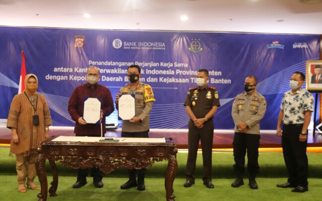 Penandatanganan Perjanjian kerjasama ini dilakukan oleh Kepala Kantor Perwakilan Bank Indonesia (BI) Provinsi Banten Erwin Soeriadimadja dengan Kapolda Banten Irjen Pol Dr Rudy Heriyanto Adi Nugroho S.H.,M.H.,M.B.A dan Kepala Kejaksaan Tinggi Banten Dr. Asep Nana Mulyana, SH.M.Hum