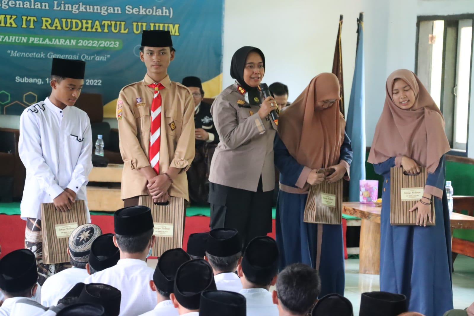 Subang Jabar, SIBER88.CO.ID_Kapolres Subang AKBP Sumarni disela-sela MPLS memberikan penyuluhan kepada para santri di pondok pesantren Al Ikhlas Raudhatul Uluum di Kp Cijerehilir, Desa Desa Tenjolaya,Kacamatan Kasomalang, Kabupaten Subang, Rabu (20/7/2022)