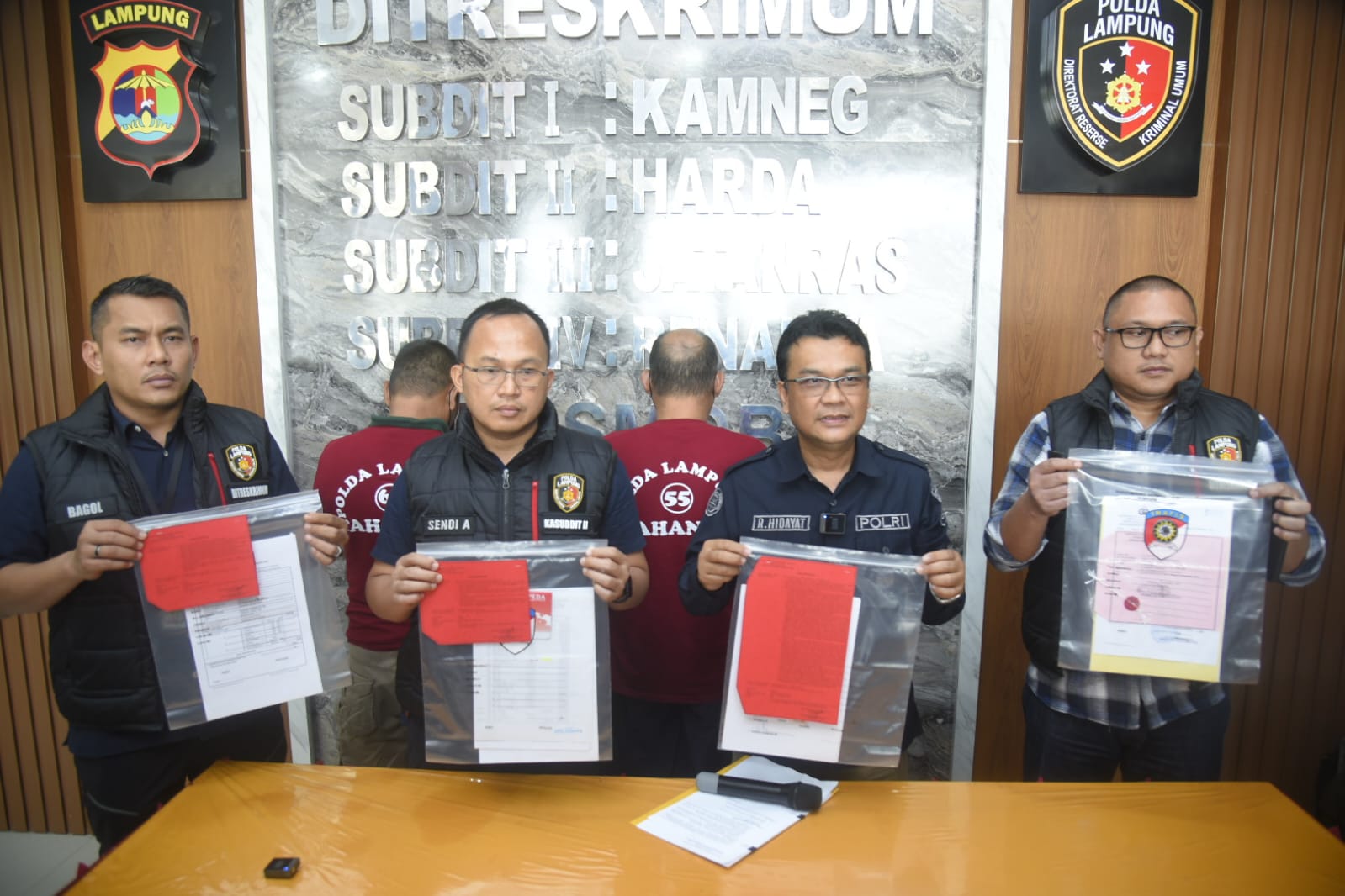 Lampung Selatan, SIBER88.CO.ID_Kasubbid Penmas Bid Humas AKBP Rahmad Hidayat didampingi Kasubdit II Harda Dit Reskrimum Polda Lampung AKBP Sendi Antoni melaksanakan Konprensi pers ungkap kasus Tindak Pidana Pemalsuan Dan Penggelapan terkait ganti rugi lahan untuk perluasan Tugu Rato Kabupaten Tubaba.