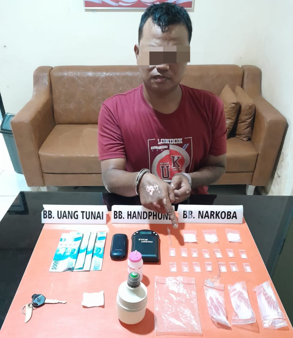 Penangkapan pelaku ini berhasil diamankan barang bukti 17 paket narkoba jenis shabu-shabu yang dibungkus dengan plastik bening, (Bruto 15.69 Gram), HP merk Samsung, timbangan digital, 3 ball plastik klip putih bening, lampu, kertas, bong, kaca pirek, uang Rp 200 ribu.