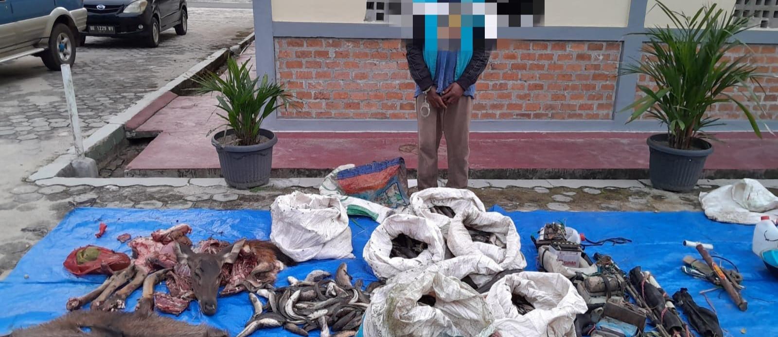 Selain tersangka, petugas juga turut mengamankan 1 unit sepeda motor, perlengkapan masak, jaring, 4 alat setrum ikan, hewan rusa hasil buruan dan karung berisi ikan sebagai barang bukti.