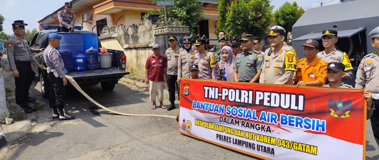 Lampung Utara, SIBER88.CO.ID_Sebagai bentuk kepedulian kepada warga yang sedang kesulitan air bersih, Polres Lampung Utara bersama Kodim 0412/LU gelar bansos air bersih, Kamis (5/9/2024).