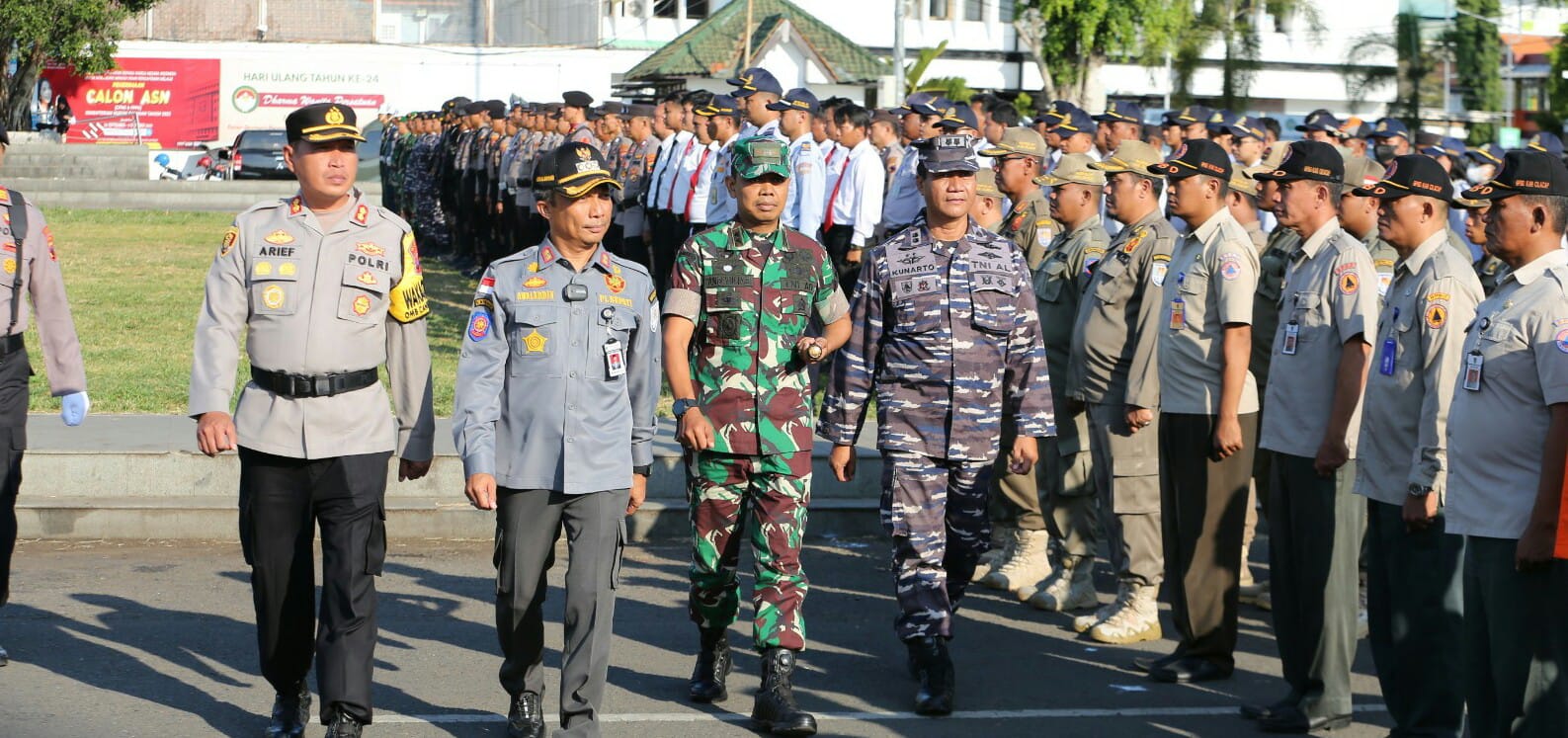 Polresta Cilacap melaksanakan apel gelar Pasukan Operasi Lilin Candi 2023 yang dipimpin oleh Pj Bupati Cilacap,Awaluddin Muuri di alun-alun Kabupaten Cilacap,Jumat(22/12/2023).
