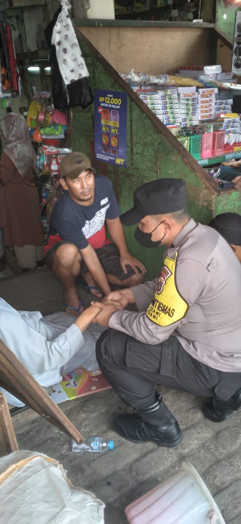Bogor Jabar, SIBER88.CO.ID_Polres Bogor, Bhabinkamtibmas Desa Ciawi Aipda Herman Sovian memberikan pertolongan pertama kepada seorang laki-laki yang tidak sadarkan diri di Pasar Ciawi, Jumat (10/6/22).