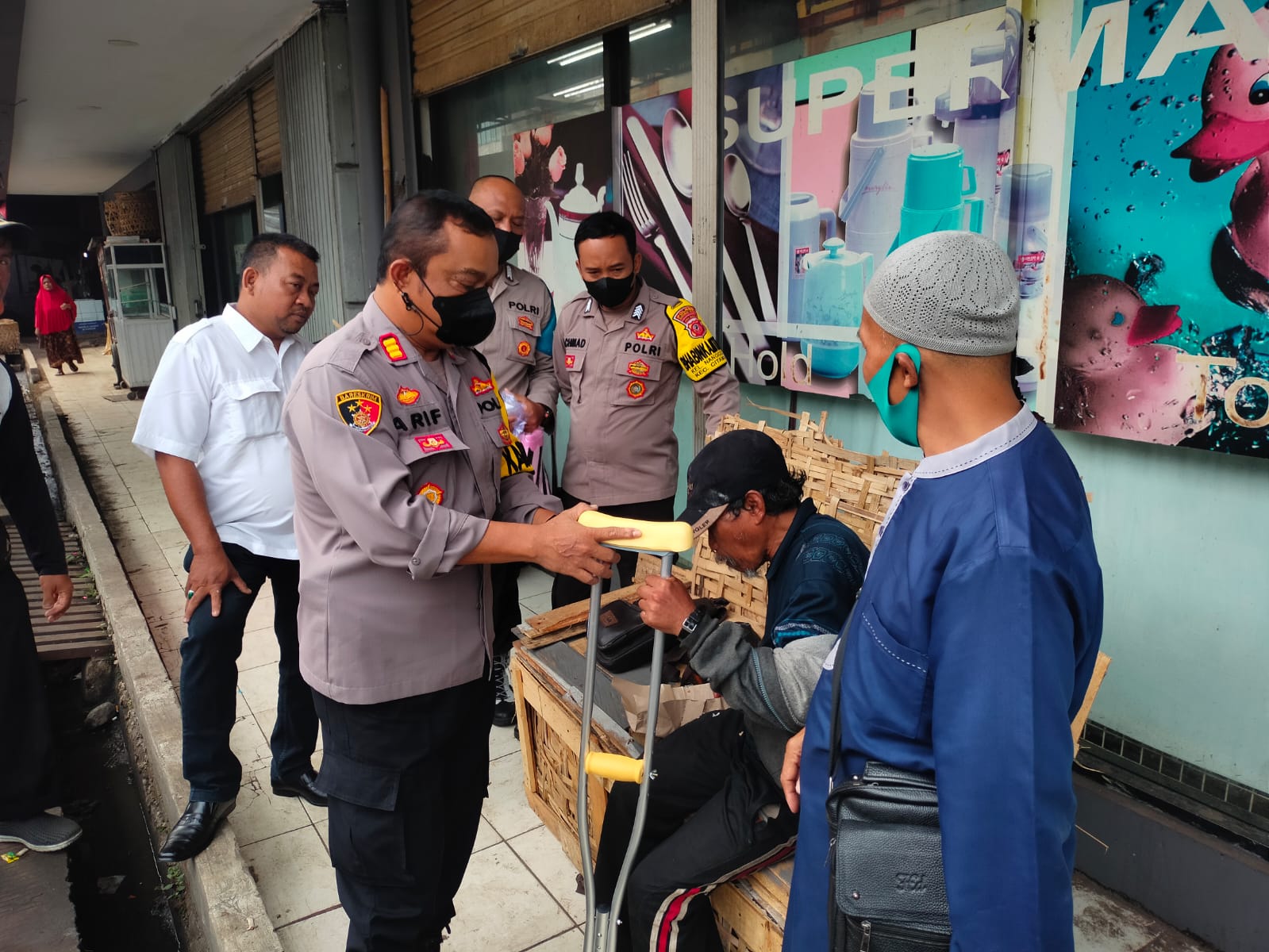 Sukabumi Jabar, SIBER88.CO.ID_Polsek Citamiang Resor Sukabumi Kota kembali selenggarakan program berbagi. Kegiatan berupa penyerahan bantuan sosial berupa tongkat dan makanan kepada tuna wisma sakit di kawasan Pasar Gudang, Jalan Pasar Gudang, Kelurahan Tipar Kecamatan Citamiang, Kota Sukabumi, Senin (10/10/2022).
