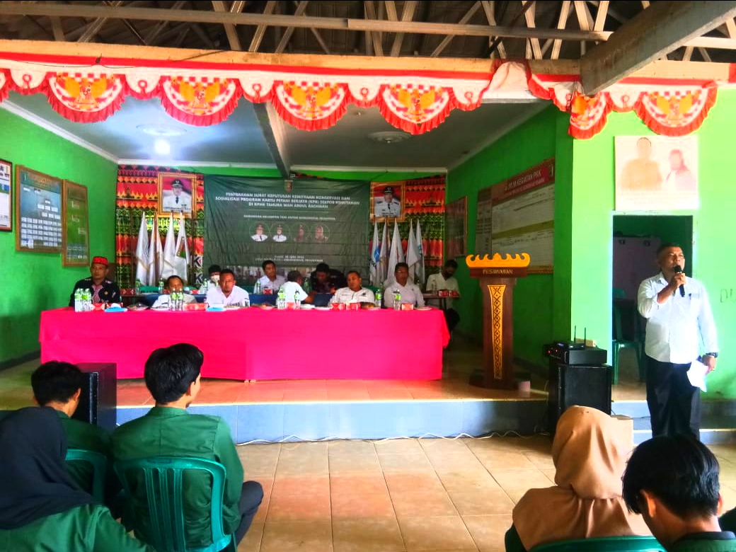 Pesawaran, SIBER88.CO.ID_Gabungan Kelompok Tani Hutan (KTH) Manunggal Sejahtera yang terdiri dari 4 desa dan terbagi dalam 10 kelompok, dari dua kecamatan yakni kecamatan Kedondong dan Waylima yaitu desa Tempel Rejo, Pesawaran, Sinar harapan dan Tanjung agung Kecamatan Waylima, hari ini menerima Surat Keputusan(SK) Pengesahan sebagai Pengelola hutan Konservasi dan sekaligus sosialisasi Program Kartu Petani Berjaya(KPB) Sektor Kehutanan Di KPHK Tahura wan Abdul Rahman Register 19 yang digelar di Kantor desa Tempel Rejo, Kecamatan Kedondong Kamis (30/06/2022).