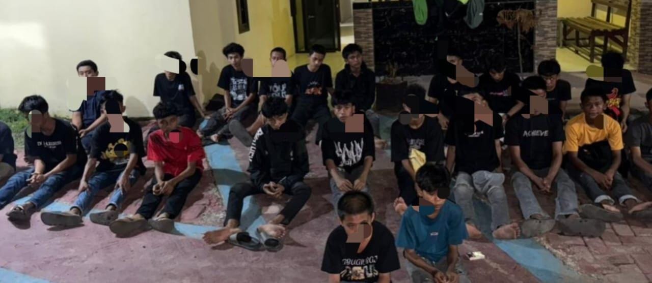Polisi menyita barang bukti berupa dua ketapel busur, tiga anak busur, tiga bilah badik, 23 unit handphone android, 12 unit sepeda motor, delapan kunci motor, tiga jam tangan, serta sejumlah tali pinggang. Sebanyak 24 pemuda berada di lokasi yang sama dan semuanya diamankan untuk pemeriksaan lebih lanjut.