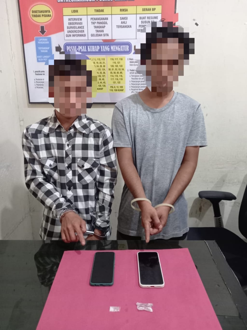 Bersama pelaku turut diamankan sejumlah barang bukti berupa 2 (dua) Paket diduga Narkotika jenis Shabu yang dibungkus dengan plastic klip putih bening, dan 2 unit Hp yang di gunakan pelaku.