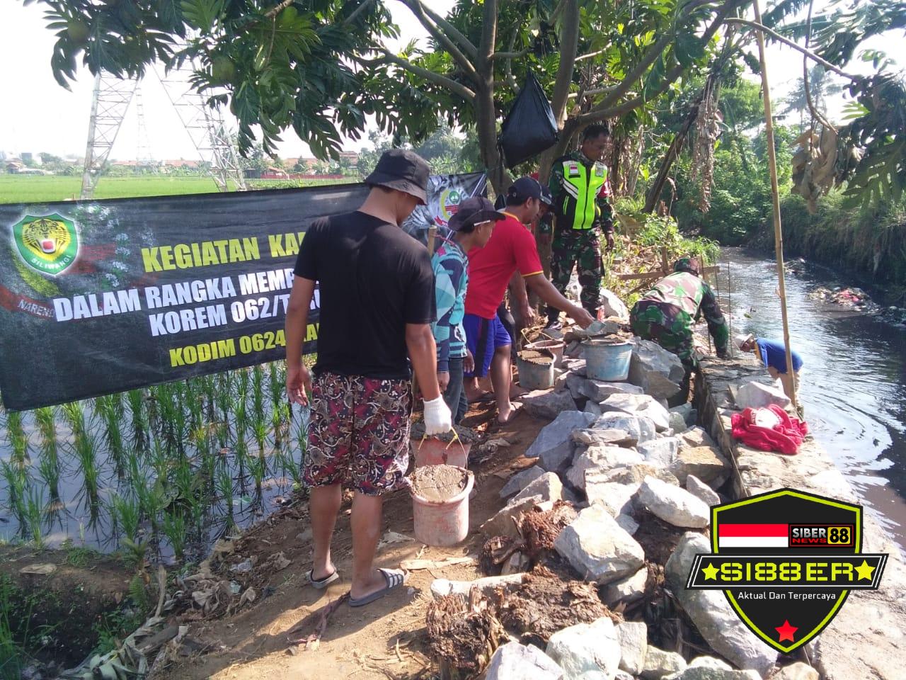 Bandung, SIBER88.CO.ID_Dalam rangka menyambut HUT ke 59 Korem 062/Tarumanagara Kodim 0624,Kabupaten Bandung mengadakan karya bhakti pembangunan tanggul sungai di Kampung Babakan RT. 08 RW. 07 Desa Rahayu Kec. Margahayu, Selasa (05/10/2021).