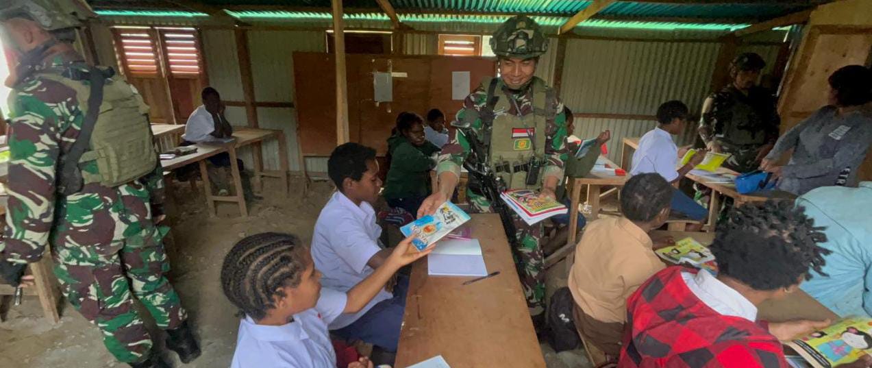 Kago Papua, SIBER88.CO.ID_Satgas Mobile Yonif 323 Buaya Putih bantu kembangkan pendidikan anak Papua melalui TK Kosatgas yang dimpimpin Pasiter Satgas Letda Chk Dani dengan membantu mengajar dan memberikan bantuan alat musik untuk SDN Ilaga, Kampung Kago, Distrik Ilaga, Kabupaten Puncak, Papua Tengah, Jumat (27/9/2024)