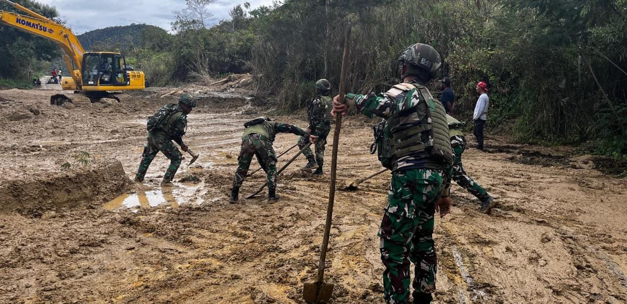 Menyikapi hal tersebut, Satgas Yonif 521/DY bersinergi dengan aparat Kepolisian setempat serta masyarakat sekitar untuk membersihkan material longsor berupa tanah, batu, dan pepohonan yang menutupi badan jalan.