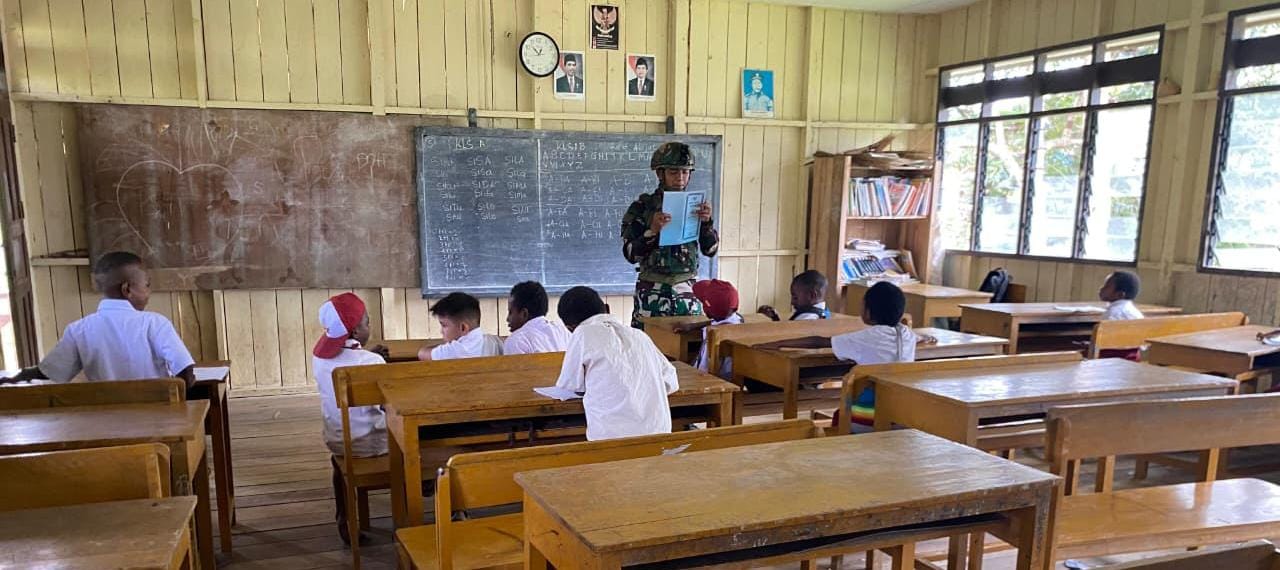 Mamberamo Tengah Papua, SIBER88.CO.ID_ Dalam rangka mencerdaskan generasi muda di wilayah perbatasan, personel Pos Eragayam Satgas Pamtas RI-PNG Kewilayahan Yonif 521/DY melaksanakan kegiatan mengajar di SD Inpres Eragayam, Kampung Wurigelebur Distrik Eragayam Kabupaten Mamberamo Tengah.