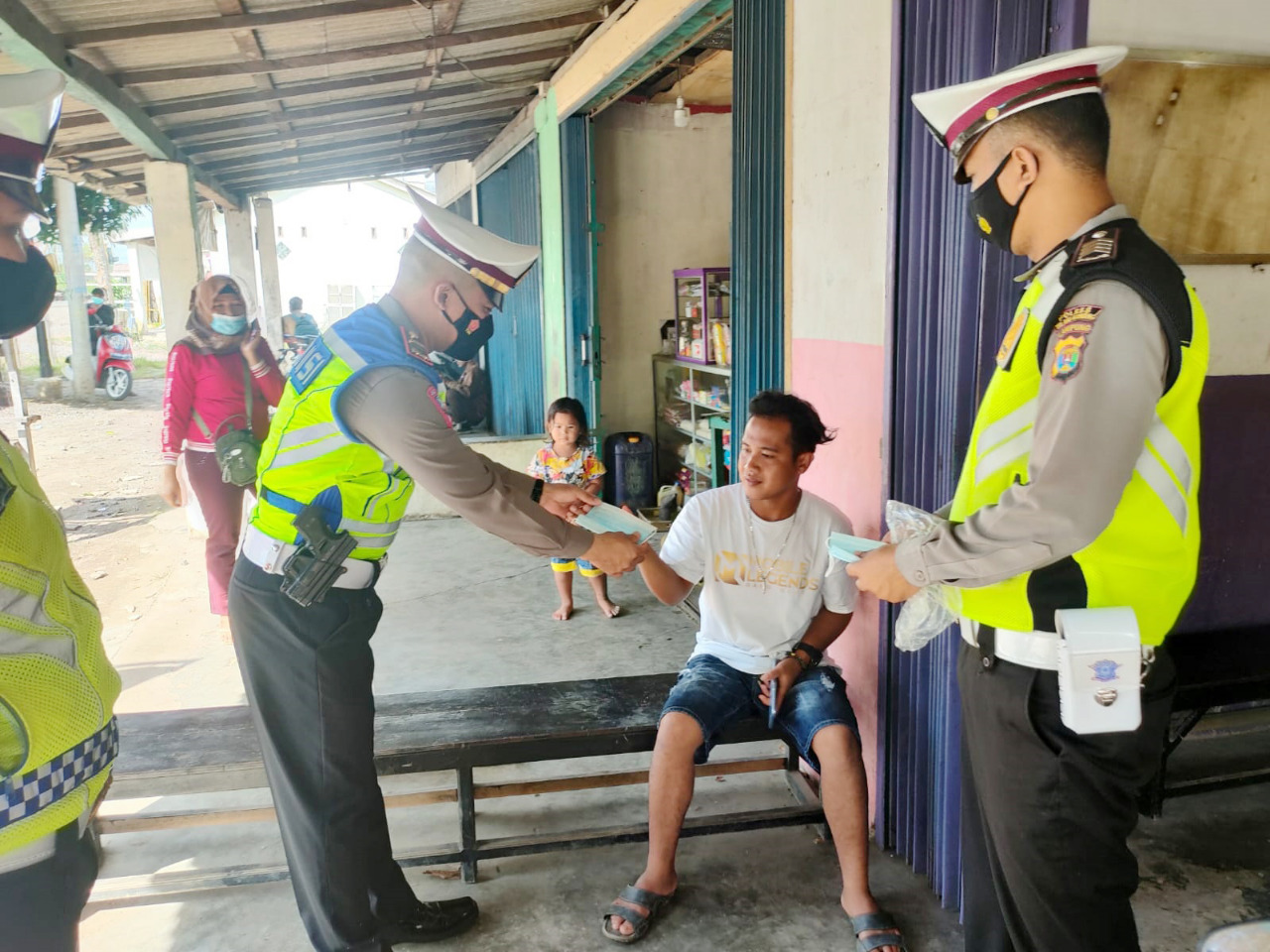Lokasi pertama, lanjut AKP Suhardo, berlangsung di Jalan Lintas Timur (Jalintim), Simpang 5, Kampung Dwi Warga Tunggal Jaya, Kecamatan Banjar Agung. Disini dibagikan masker sebanyak 50 pieces.