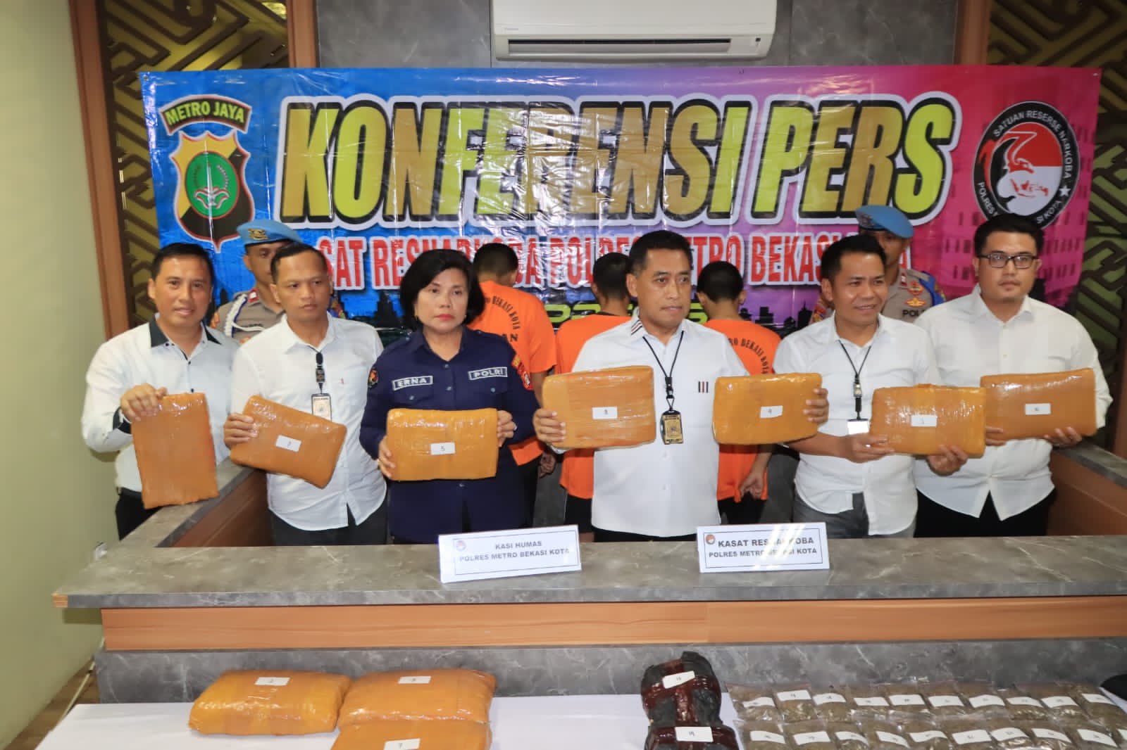 Kasatresnarkoba Polres Metro Bekasi Kota AKBP Guntur Nugroho, S.H, AmKom, mewakili Kapolres Metro Bekasi dalam konferensi pers kepada media menjelaskan keberhasilan Satresnarkoba unit 1 pimpinan Kanit 1 Iptu M. Situmorang S.H, M.H, bersama timnya berhasil mengungkap kasus narkotika jenis ganja pada tanggal 15 juli 2023 dengan tempat kejadian perkara sebuah rumah kost di jalan Masjid Al Akhyar No. 100 RT 03 RW 06 Kelurahan Kemiri Muka Kecamatam Beji Kota Depok.