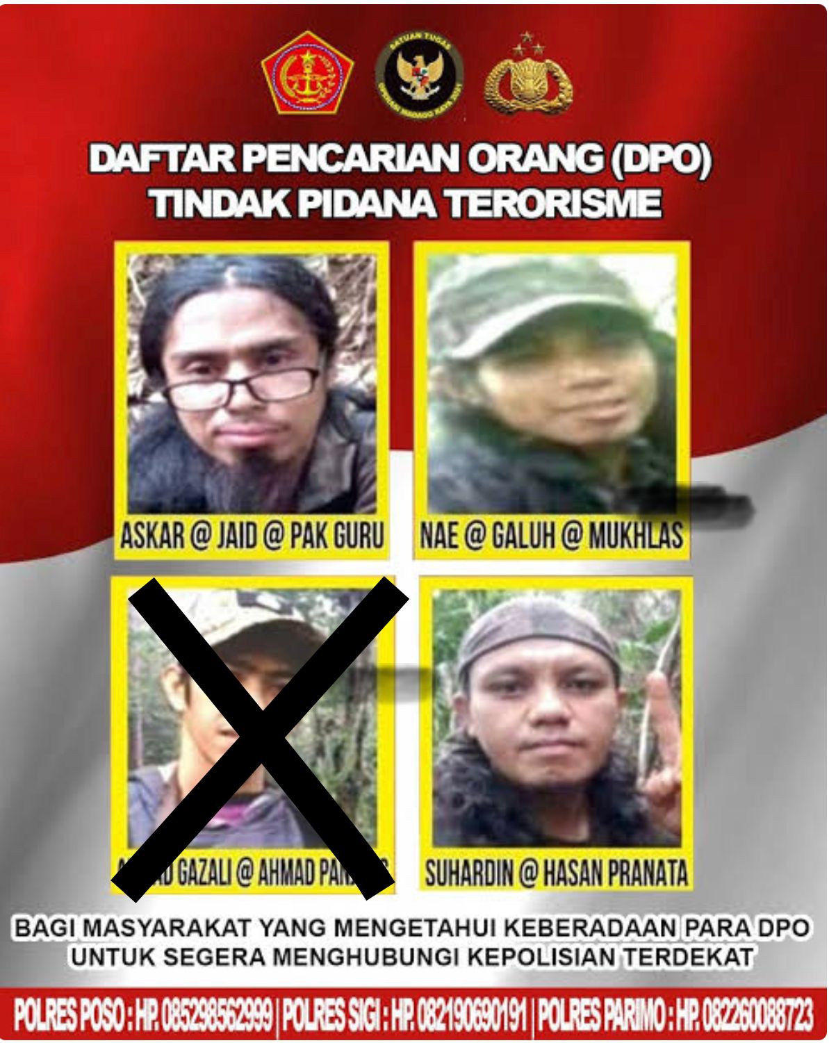 Satgas Madago Raya masih terus menghimbau kepada sisa DPO teroris Poso yang masih berada dipegunungan baik di Kabupaten Parigi Moutong, Poso dan Sigi untuk segera menyerahkan diri kepada Satgas Madagoraya baik TNI-Polri supaya tidak ada lagi korban jiwa, masih ada kesempatan untuk bertaubat dan bergabung kembali kepada NKRI dan bertemu dengan pihak keluarga, pungkasnya. (red)