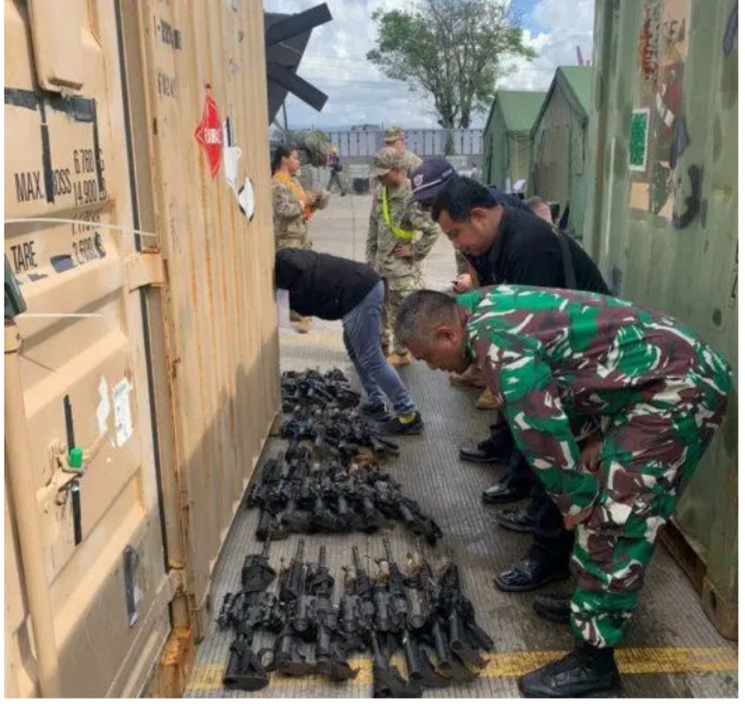 “Senjata itu akan di gunakan untuk latihan dalam kegiatan Garuda shield untuk di Data dan dicocokan sebelum di bawa ke Puslatpur”, kata kepala penerangan Korem 043/Gatam Mayor (Cpm) Eva Y Kamal saat klarifikasi di pelabuhan Panjang.