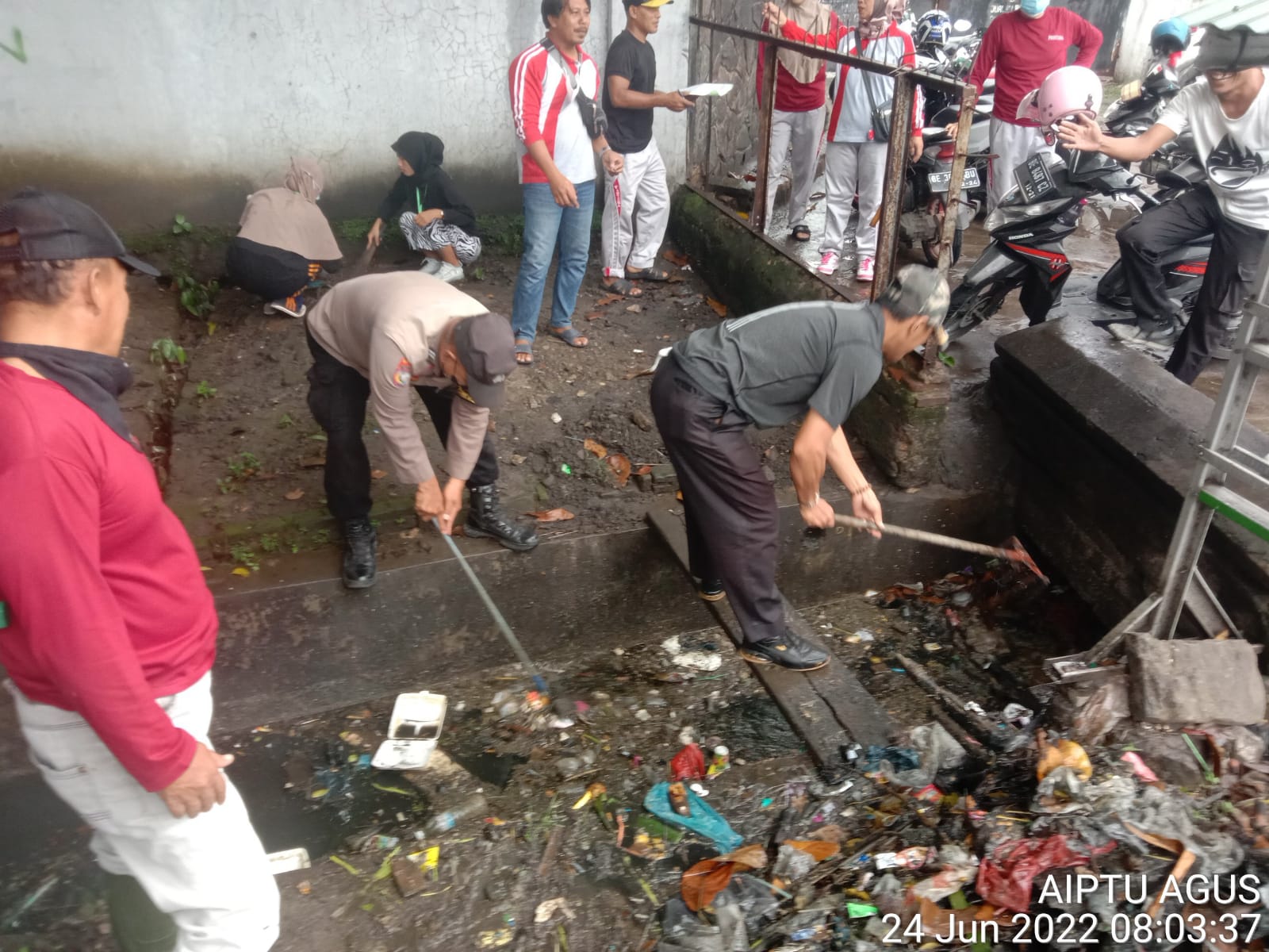 Kali ini Bhabinkamtibas Aiptu Agus Yulianto bersama Pamong setempat sampai dengan seluruh ketua RT Keluarahan Panjang Utara serta warga sekitar membersihkan sampah yang tergenang di saluran air di depan Ex PT. DAYA SAKTI panjang.
