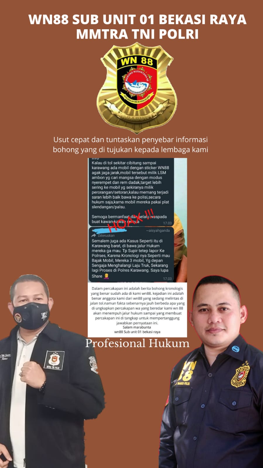 Bekasi Jabar, SIBER88.CO.ID_Telah viral berita informasi di media sosial pencemaran nama baik wn 88 bekasi raya yang terjadi kepada anggota kami yang sudah di berikan SK WN 88 Sub Unit 01 Sektor Cikarang Barat dan sudah di legalkan oleh ketua wn 88 bekasi raya Mahdi Soekarta, T.Bob. S.Thi.selaku ketua wn88 sub unit 01 bekasi raya merasa di rugikan atas oknum yang mencemarkan wn 88 seluruh indonesia,” ujar Arif