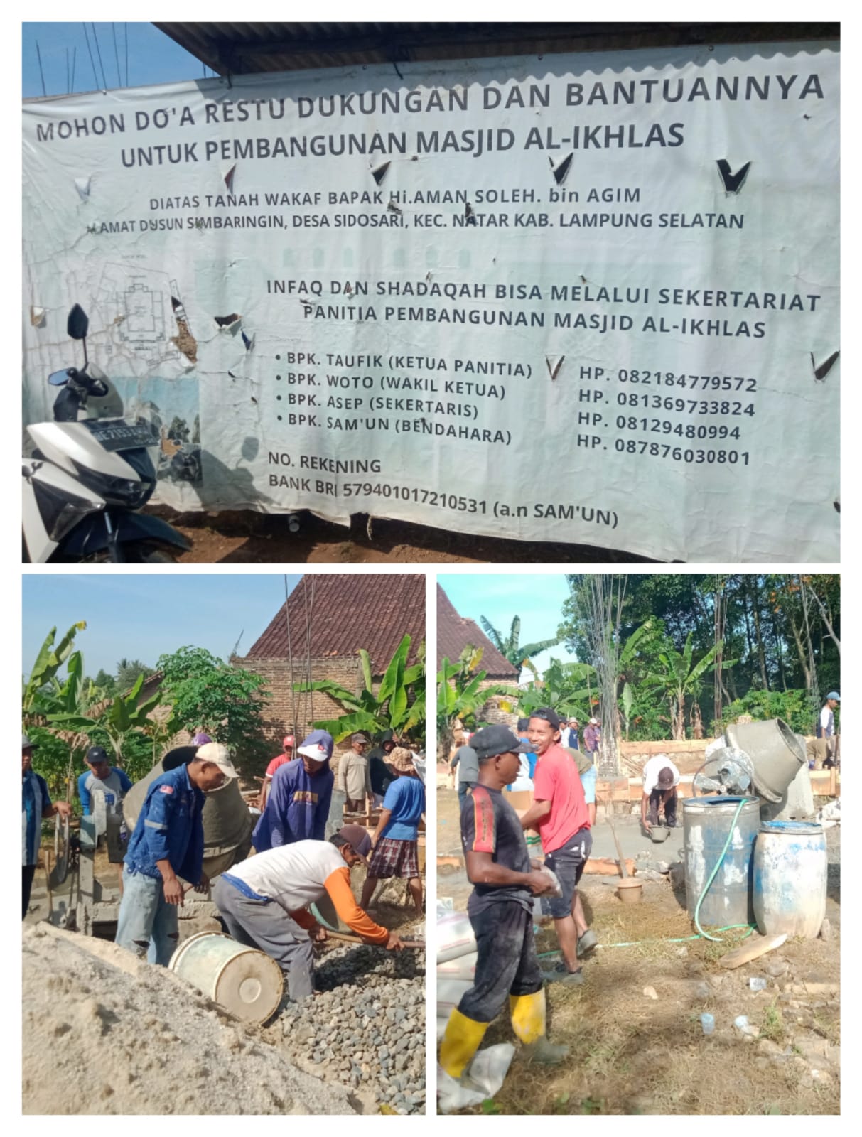 Mohon doa restu dukungan dan bantuannya untuk pembangunan Masjid Al-IKHLAS, diatas tanah wakaf Bpk. Hi. Aman soleh bin Agim. Infaq dan shadaqah bisa melalui sekretariat panitia pembangunan Masjid Al-IKHLAS;