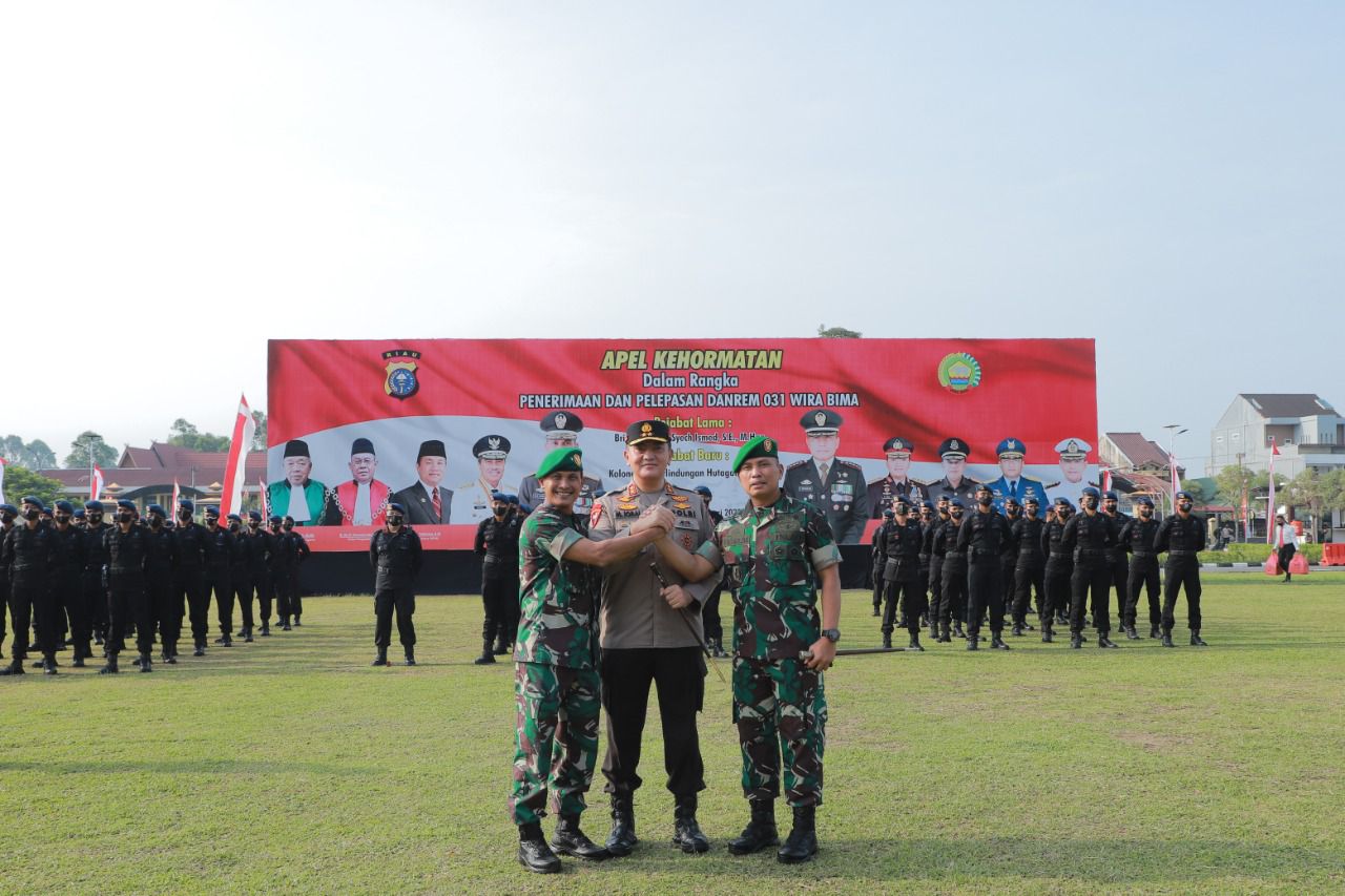 Danrem 031/Wirabima dan seluruh pimpinan Forkompinda Riau mengikuti Apel Kehormatan dalam rangka Penerimaan dan Pelepasan Danrem 031/Wirabima di halaman Mapolda Riau.