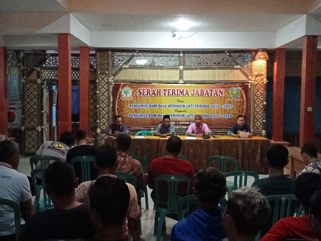 Ketua Bumdes Weringin Jati yang lama Koharudin SPd secara resmi menyerahkan jabatan dan uang senilai 130.000.000 rupiah kepada ketua Bumdes yang baru H Anas Ghozali untuk periode 2022-2026.