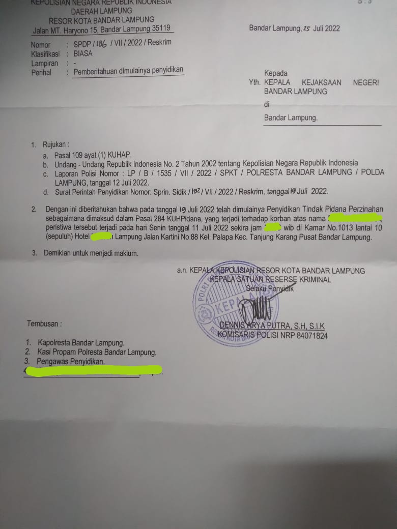 Hal itu sesuai dengan surat pemberitahuan Penyidikan dari Reskrim Polresta Bandar Lampung tanggal 19 Juli 2022 .