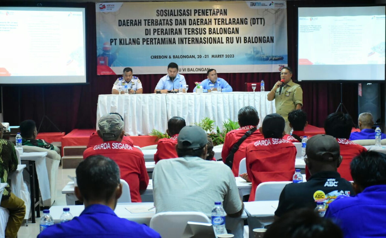 Indramayu Jabar, SIBER88.CO.ID_ Penetetapan Daerah Terbatas Terlarang(DTT) untuk wilayah Perairan Terminal Khusus(Tersus)Balongan PT Kilang Pertamina Internasional (KPI) Unit VI Balongan menggelar kegiatan sosialisasi yang dilaksanakan 20-21 Maret 2023.