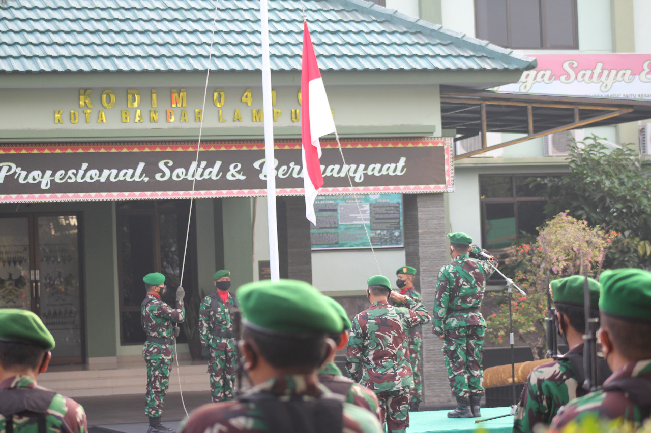 Bandar Lampung, SIBER88.CO.ID_Kodim 0410/ Kota Bandar Lampung laksanakan upacara bendera. Sejumlah Prajurit dan PNS mengikuti upacara dengan khidmat.