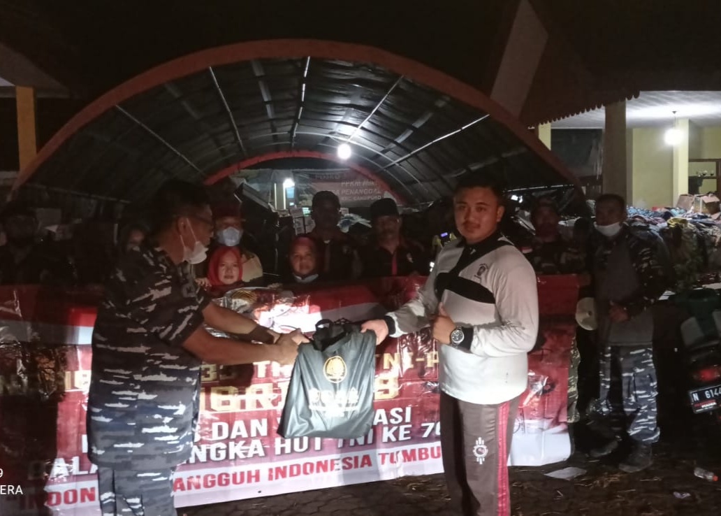 Lumajang, SIBER88.CO.ID_TNI AL peduli terhadap masyarakat terdampak erupsi Gunung Semeru yang erupsi 4 Desember lalu, salah satunya tim dari Penelitian dan Pengabdian kepada Masyarakat (PPM) Akademi Angkatan Laut (AAL) menyalurkan bantuan sembako bagi masyarakat di Posko Pengungsian Balai Desa Penanggal kecamatan Candipuro dan Balai Desa Condro Kecamatan Pasirian kabupaten Lumajang, Jawa Timur, Minggu (5/12) malam tadi.