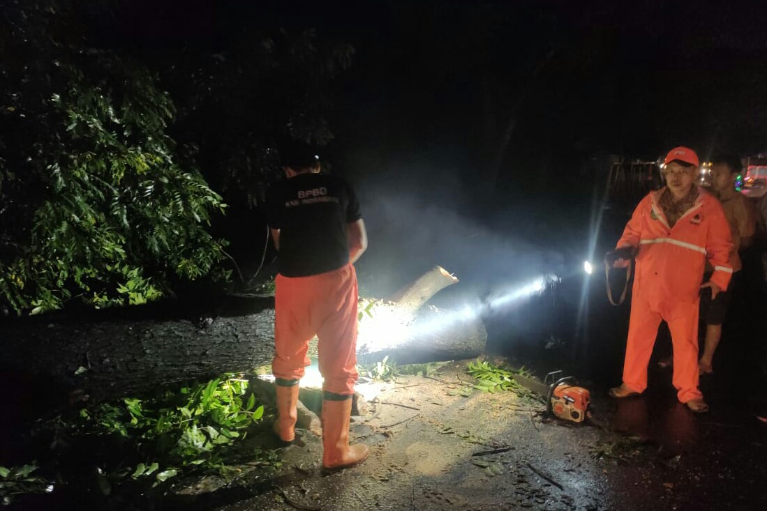 Tim BPBD memotong bagian-bagian batang pohon besar kemudian mengevakuasi ke tempat yang lebih aman.