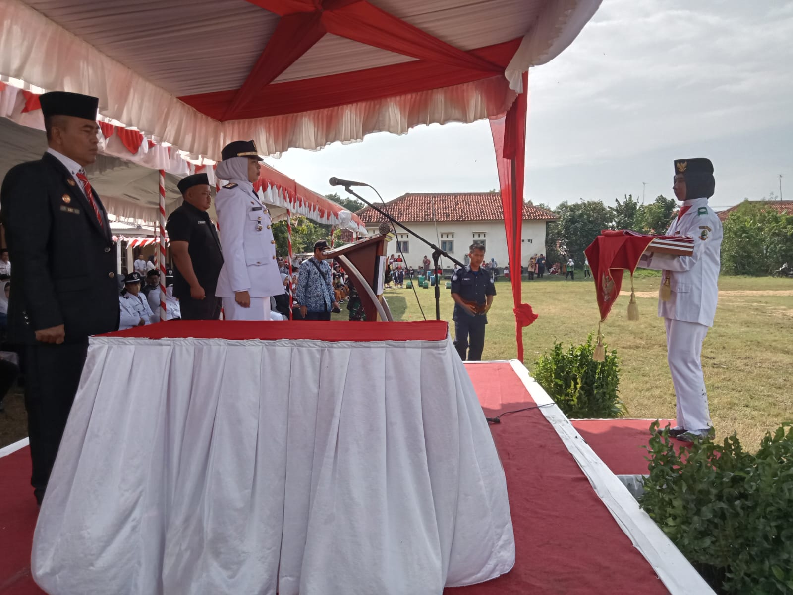Paskibra yang mengiringi upacara pengibaran bendera adalah perwakilan putra-putri terbaik dari SMK Taruna Tambi kecamatan Sliyeg Indramayu.