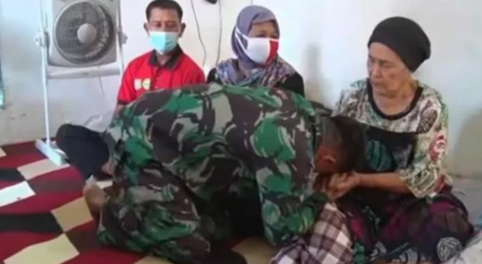 Koptu Mesman terlihat sesekali menyeka air mata saat mencium tangan dan bersimpuh meminta maaf kepada ibunya.