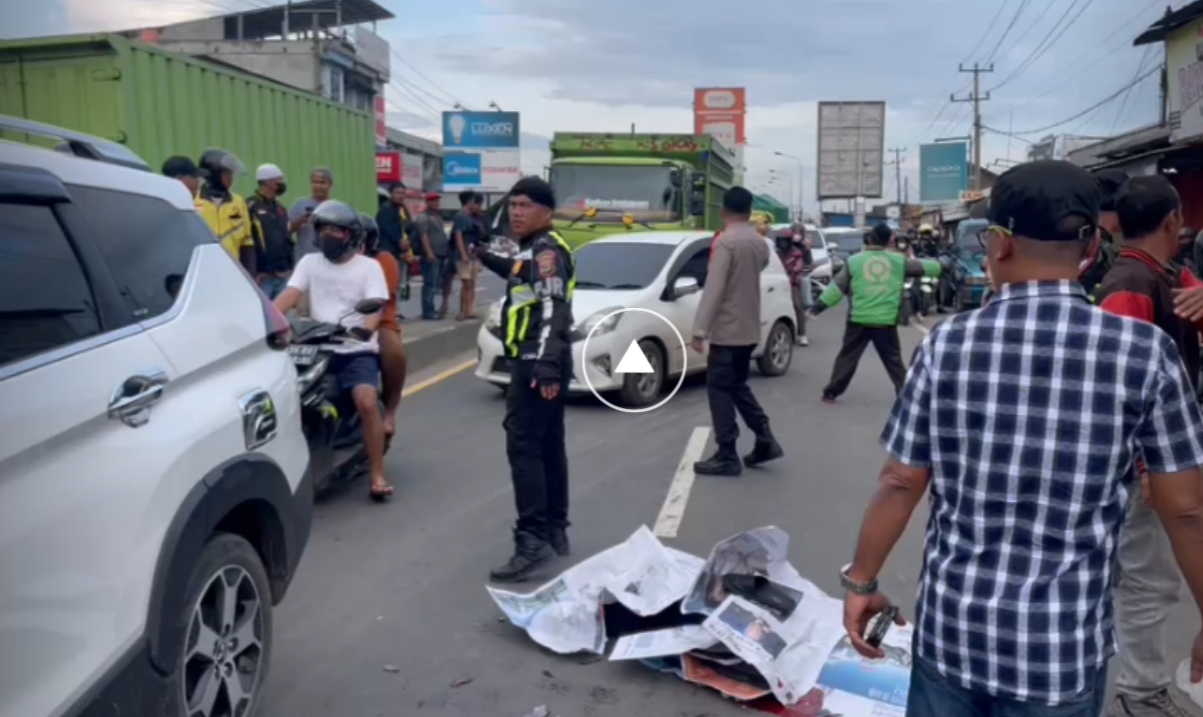 Tampak arus lalu lintas berjalan agak tersendat, dimana mobil dan sepeda motor melambatkan laju kendaraannya untuk melihat korban yang tergeletak ditutupi koran.