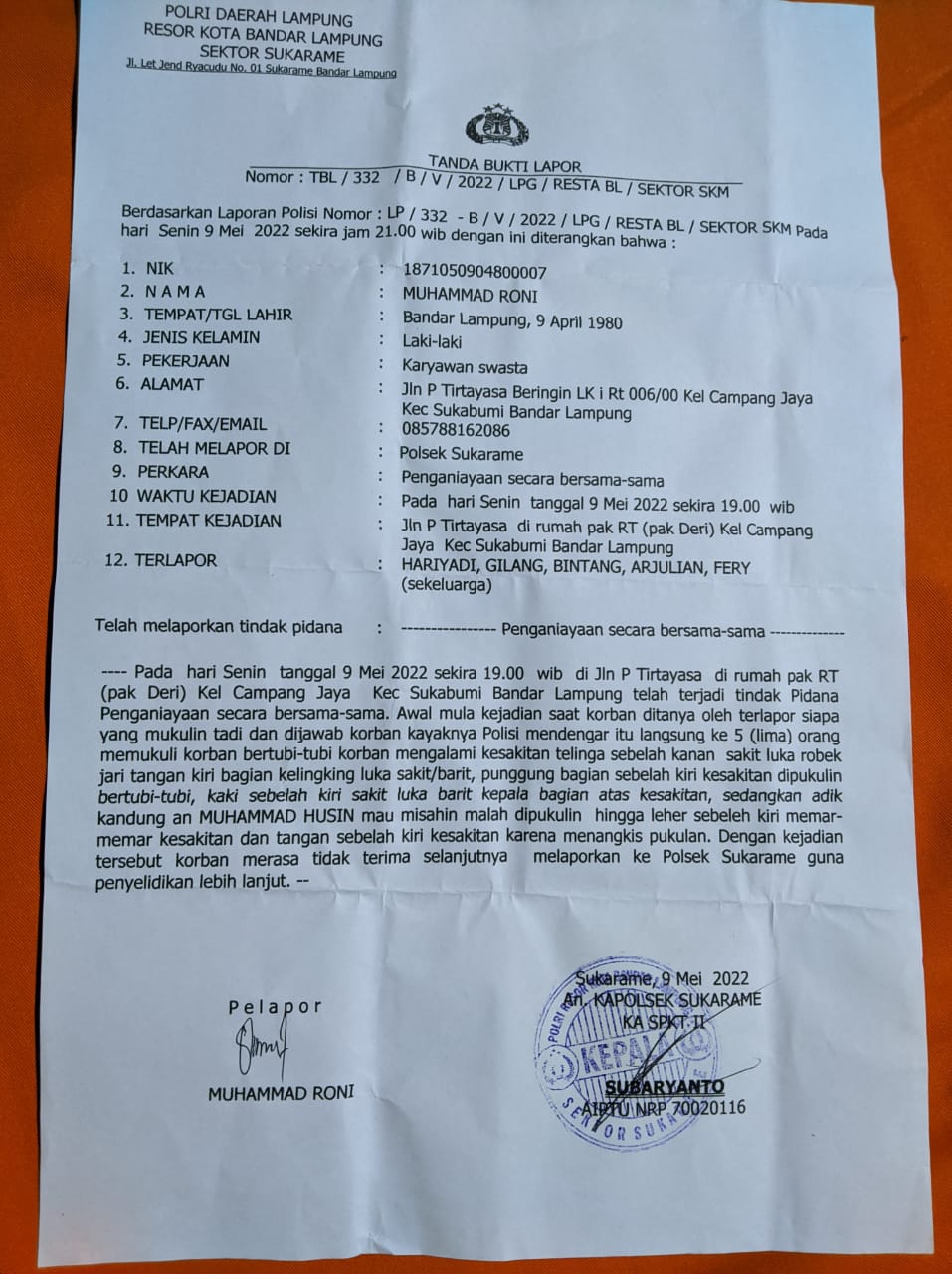 Roni mengalami luka memar di bagian bibir dan muka serta kepala dan melaporkan HR, FR, GL, BN dan AR ke Polsek Sukarame, dengan no laporan No. LP/332-B/V/2022/LPG /RESTA BL/ SEKTOR SKM perkara Penganiayaan Bersama sama, tertanggal 09/05/2022 yang ditanda tangani oleh AIPTU Subaryanto. (Erwin.M)