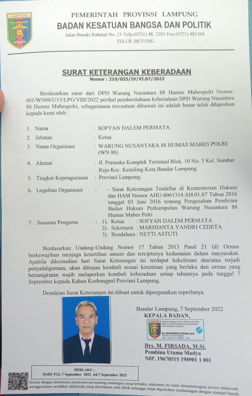 Bandar Lampung, SIBER88.CO.ID_ Warung Nusantara 88 ( WN88 ) Mitra TNI-POLRI Unit 13 Lampung, telah menerima surat keterangan kepengurusan Organisasi Kemasyarakatan rabu, (7/9/22).